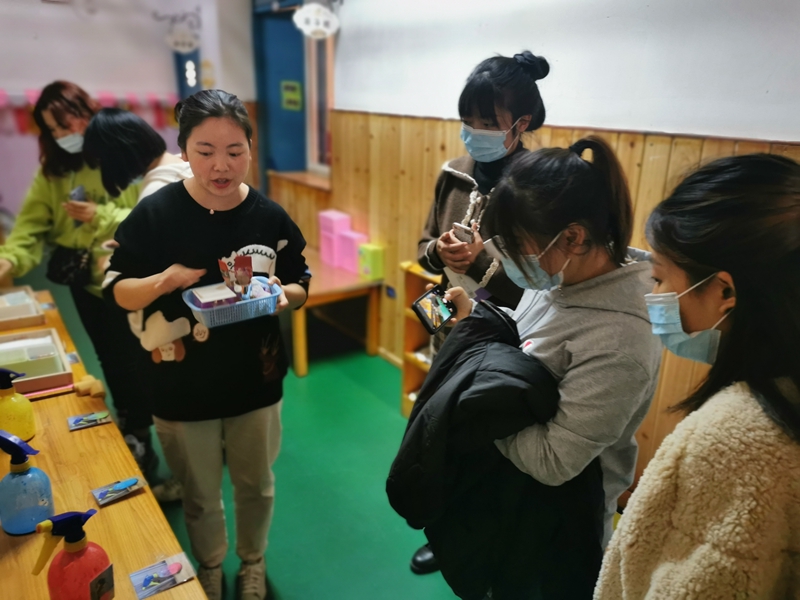 接着,老师们进入班级参观班级环境创设。走进小班活动室,美工区各式各样的玩色工具、手工材料,温馨的娃娃家,锻炼精细动作的生活区,使得老师们连连称赞于教师为孩子们游戏提供充足支撑的细致周到。中班洗衣房里晾晒的一件件衣服引起了老师们的兴趣,马兰园长为老师们介绍到:孩子们在洗衣房里不仅可以洗衣服、折衣服,还可以自选高的衣杆或者矮的衣杆来晾晒衣服,充分尊重孩子们的个体差异,让所有的孩子都能尽情游戏。大班创设的新闻播报站、宠物美容院、泡泡照相馆、一品茶舍都让老师们流连忘返。老师们纷纷表示看到了光祈幼儿园一班一特色,与儿童对话的环境,他们一致肯定,教师应遵循幼儿的身心发展规律以及认知水平,充分利用有限空间为孩子们创设富有教育意义的学习、游戏、生活的环境。