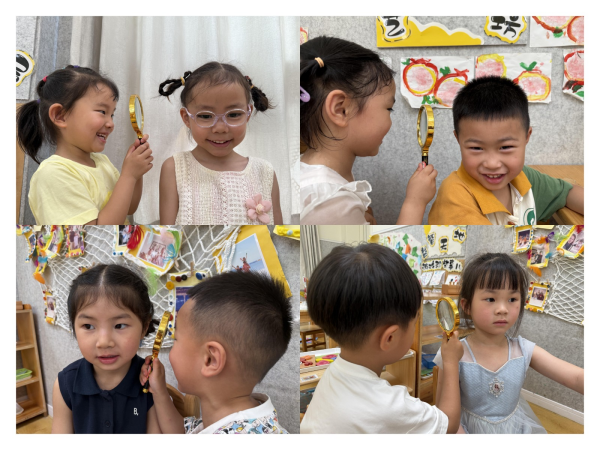 为了满足孩子们的好奇心,我们在生活区提供了放大镜,孩子们用放大镜来观察小耳朵。