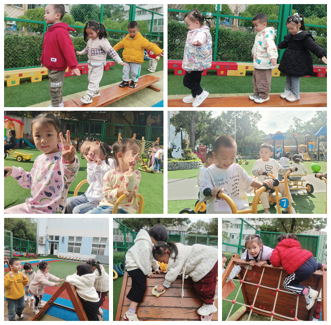 户外场地上,宝贝们走平衡木、骑小脚踏车,在攀爬架上勇敢向上……跑跳间身体棒棒,还懂互相帮忙。