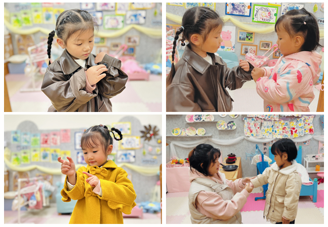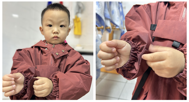 教师鼓励孩子们仔细观察袖子的特点,亲手尝试用不同办法解决问题。充分的自我探索,不仅锻炼了小手的灵活性,更让“自己的事情试着自己解决”的自我服务意识慢慢发芽。