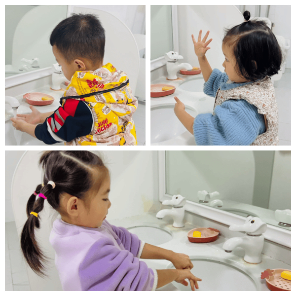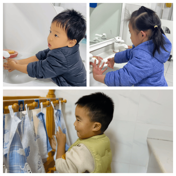 从孩子“袖子总打湿”的真实困扰出发,老师并非直接灌输技能,而是把探索权交给孩子。教师以“支持者”的角色引导孩子,不直接给答案,而是鼓励大家通过求助、尝试工具等方式解决问题。最终孩子掌握挽袖技巧、学会调节水流、洗手后主动甩干,收获自我服务的快乐。