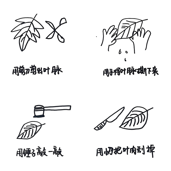 使用闹钟精准控制煮制时间;轻柔刷洗,叶肉顺利脱落,叶脉完整清晰;经过晾干、压平,第一片完整的叶脉书签终于诞生!