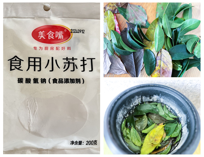 二十分钟后:水变为棕色,叶子颜色转黄,叶肉略有松动,但仍无法完全清除。东东提出:“是不是小苏打加得不够?”孩子们一致同意增加小苏打用量,继续煮制。