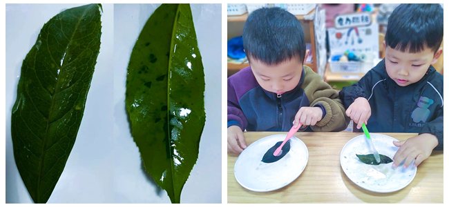 若曦用力过猛,叶片被刷破;冬冬轻刷慢揉,叶肉自然脱落,叶脉完整呈现。也有好几个小朋友发现叶子还没刷,已经坏了。