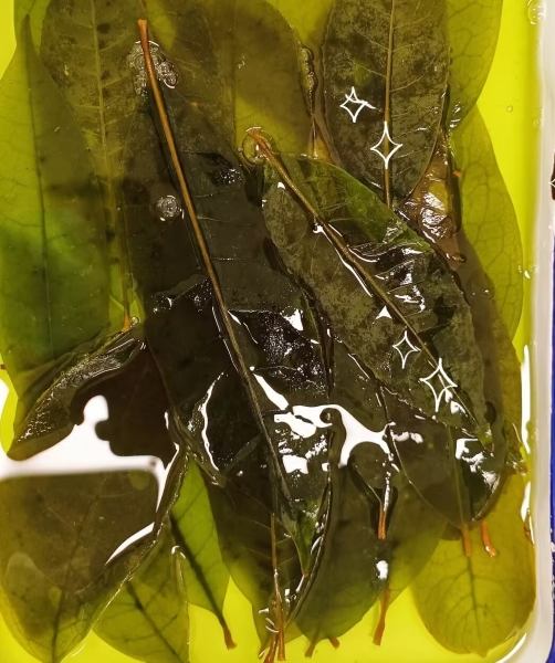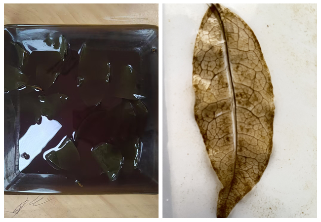 两小时后:叶子颜色加深,涵涵成功刷出部分叶脉,叶肉去除大半,但叶脉不完整,主叶脉易与叶片分离,效果仍不理想。
