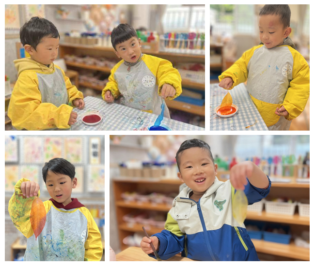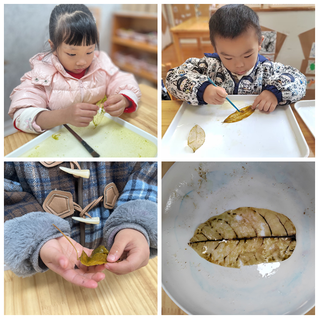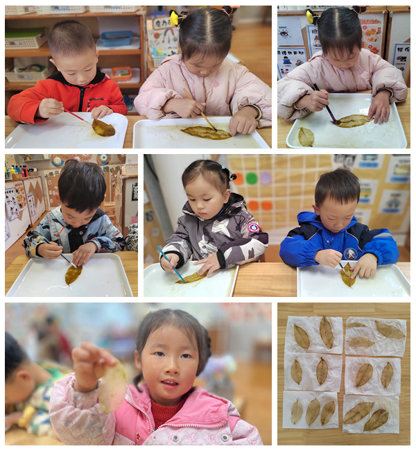 在第三次制作中,孩子们的操作更加熟练:精选桂花叶、玉兰花叶作为材料;