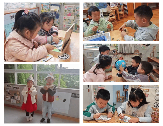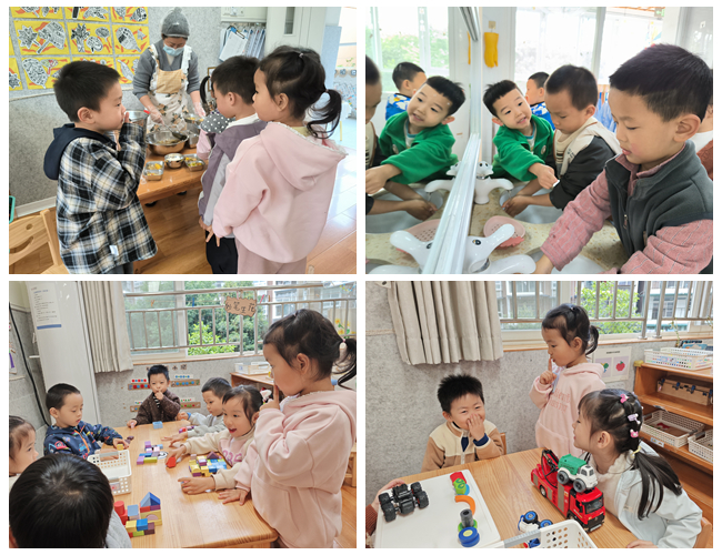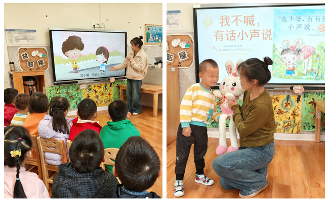 区域中的变化:在区域活动中小声交流,孩子们更加专注于操作;游戏中的变化:孩子们学会安静聆听游戏规则,在游戏中注意控制音量的大小;一日生活中的变化:孩子们学会安静排队、盥洗和进餐。
