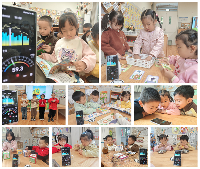 孩子们充满好奇地将分贝仪放在一旁,有的踮着脚尖凑近观察指针摆动,有的试着轻声说话再突然提高音量,还有的试验着“什么样的声音会让仪器变绿”……孩子们都自觉放轻了动作,认真感受声音与仪器反馈的关联。他们发现轻声交流、安静活动时,指针指向绿色区域;正常沟通或区域游戏、户外活动时,指针跳到黄色区域。