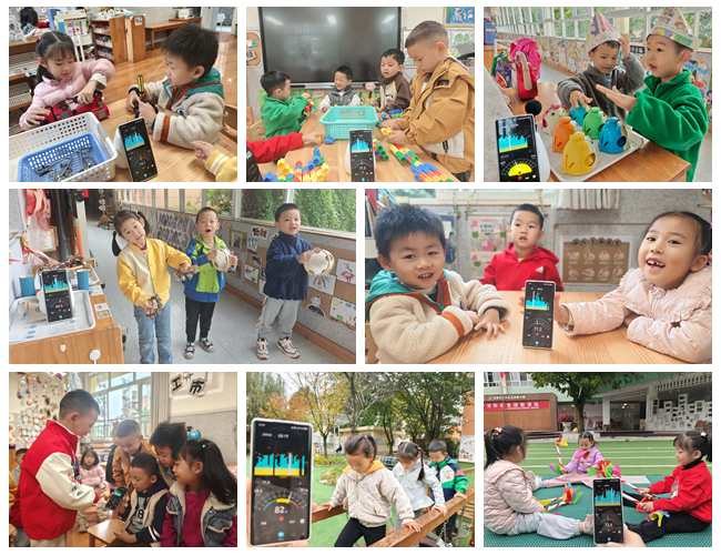 孩子们充满好奇地将分贝仪放在一旁,有的踮着脚尖凑近观察指针摆动,有的试着轻声说话再突然提高音量,还有的试验着“什么样的声音会让仪器变绿”……孩子们都自觉放轻了动作,认真感受声音与仪器反馈的关联。