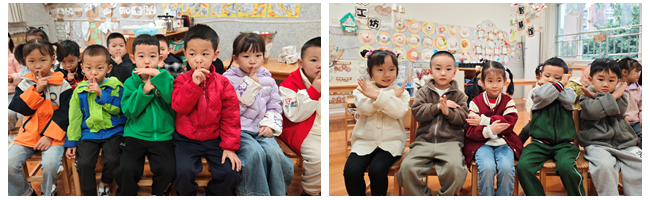 孩子们佩戴自己设计的标志牌并轮流当“声音管理员”,只要发现同伴大声说话就比“嘘”提醒,遇到声音超标会告知“现在是绿色声音时间”。在这一过程中,幼儿不仅学会了在交往中控制自己的声音,更学会了用文明的方式提醒同伴。在轻声标志和管理员的助力下,班级嘈杂声少了,取餐、区域活动、盥洗时,孩子们都能轻声交流、有序活动。