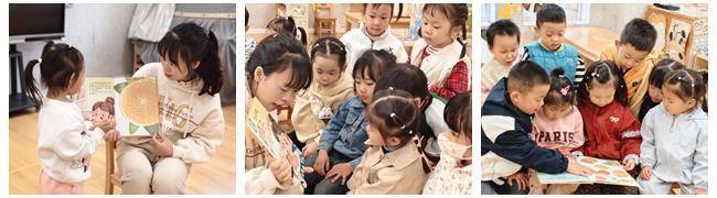 青橘的酸涩味道,让孩子们的疑问更加强烈,大家的问题一个接一个,充满了对自然的好奇与探索欲。遵循《3-6岁儿童学习与发展指南》中“从幼儿感兴趣的事物中挖掘教育价值”的教育理念,老师决定追随孩子的脚步,一起解开橘子成长的秘密。带着疑问,孩子们和老师一起共读了绘本《橘子,你从哪里来》,其中讲述了橘子从开花、结果到成熟的生命旅程。孩子们听得入迷,还不时发出惊叹,原来幼儿园橘子树上小小的、青绿色的橘子还没有成熟,所以才会酸酸的,也明白了未成熟的果子不适合品尝的自然规律,更在心里埋下了“耐心等待橘子成熟”的种子。