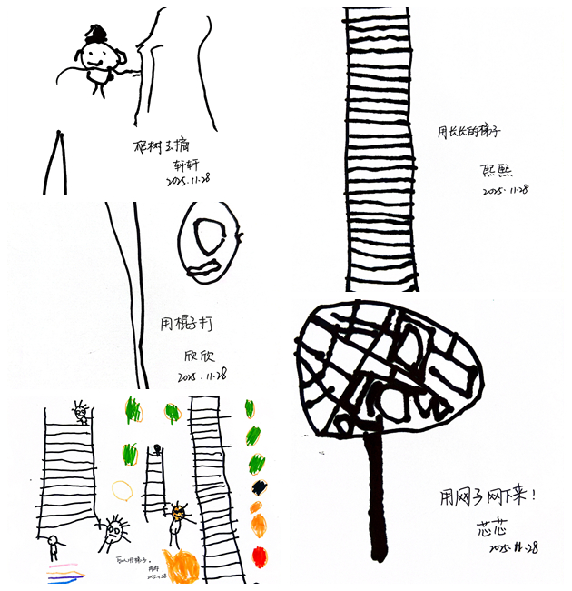 面对满树金黄的橘子,“如何把它们摘下来?”成了孩子们热议的话题。孩子们你一言我一语,提出了各种各样的想法,还将各自的想法用画笔记录下来。