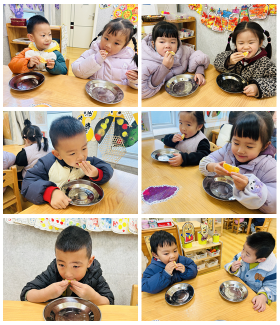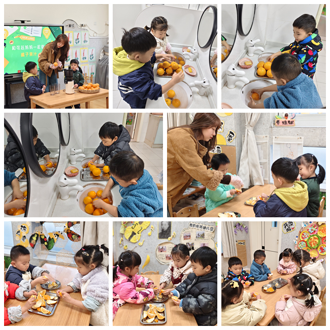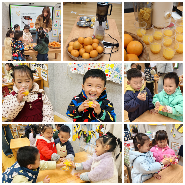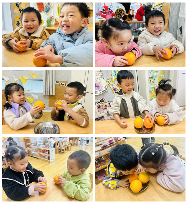 从树下的偶然发现,到舌尖的酸涩体验;从等待橘子成熟的期盼,到丰收采摘的喜悦;从对橘子的感官探秘,到了解橘子的多元价值,这场与孩子们生发的“你好呀,橘子”探索之旅,充满了惊喜与成长。过程中,孩子们用眼睛观察、用小手触摸、用鼻子闻嗅、用嘴巴品尝、用大脑思考,不仅认识了橘子的生长过程、种类和价值,更在亲身体验中发展了动手操作能力、语言表达能力和解决问题的能力。